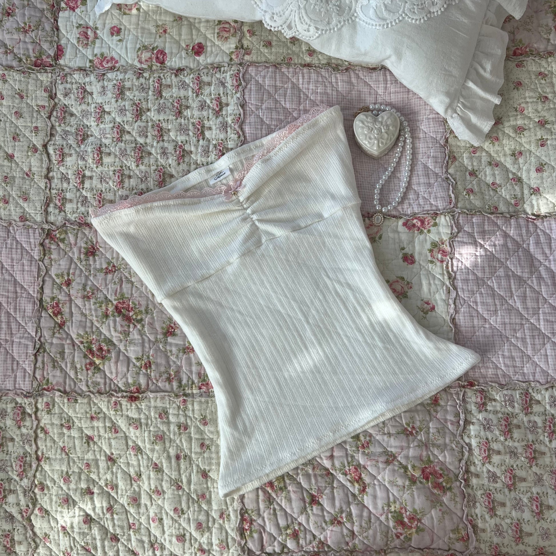 handmade with a white buttery fabric, pink lace details, pink bow & a dainty gold heart charm.