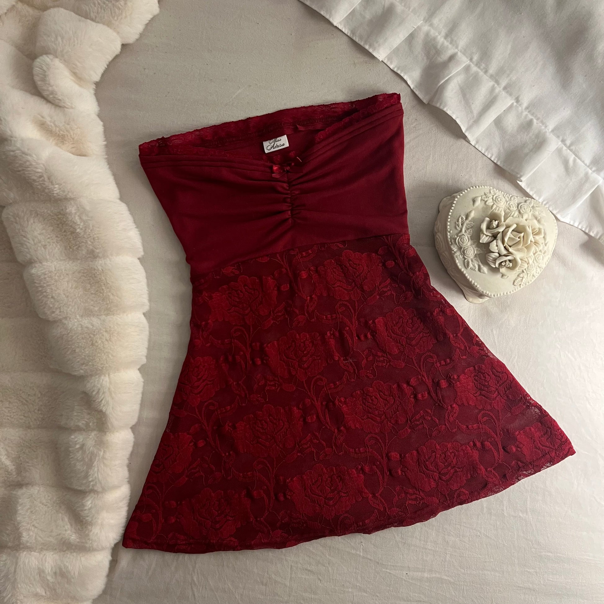 ♡ this top is handmade with a soft red fabric, red lace fabric, & a red bow. it is a babydoll fit, tight on the bust & loose on the waist.