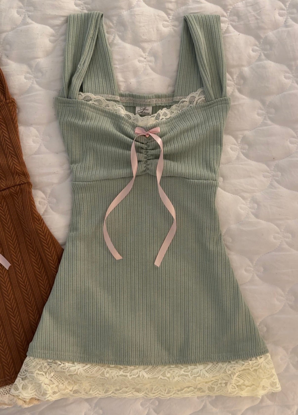 ♡ handmade with a sage green knit fabric, cream lace details, & a pink bow with a pink heart charm.