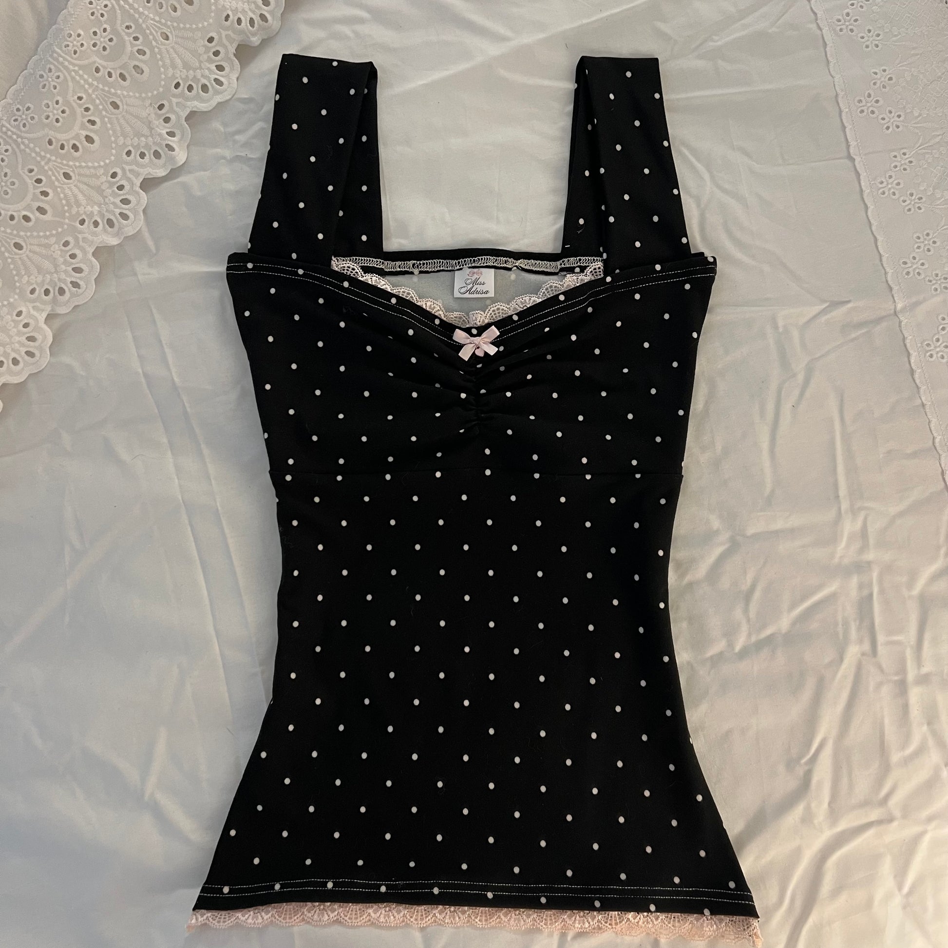 ♡ handmade with a polka dot stretch fabric, pink lace along the neckline & hemline, & a pink bow with a pink heart charm.